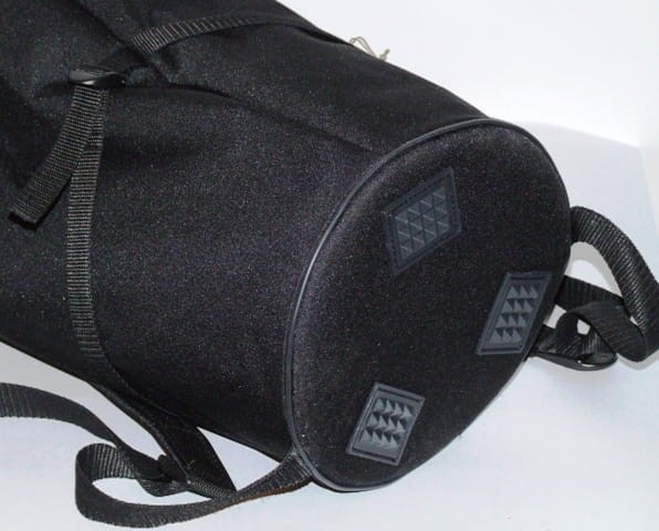 Pokrowiec na djembe 13 - 14 cali wykonano z wodoodpornej kordury. Cordura z której wykonane są pokrowce na djembe, podobnie jak różnego rodzaju sprzęt turystyczny i odzież wierzchnia, np. kurtki zimowe, jest materiałem o odpowiednich właściwościach odpornych na zmieniające się warunki klimatyczne. Przede wszystkim jest to materiał bardzo wytrzymały, odporny na uszkodzenia oraz wilgoć, dzięki temu że od środka pokryty jest specjalną warstwą PCV. Gęste sploty nici nylonowych jakie są zastosowane w pokrowcach, również dają pewność że pokrowiec nie będzie przemakał w miejscu szycia.Dno pokrowca jest usztywniane na gumowych stopkach, które zabezpieczają djembe przed nasiąknięciem od mokrego podłoża, a sam pokrowiec od zabrudzenia. Pokrywa jest usztywniona chroni membranę bębna przed uszkodzeniami mechanicznymi. Góra ściągana jest przez sznurek, ułatwiający dopasowanie się pokrywy do membrany. Poniżej dodatkowy pasek zaciskowy, dostosowujący cały pokrowiec do kielicha bębna. Regulowana długość szelek, pozwala na dopasowanie pokrowca do wzrostu użytkownika.