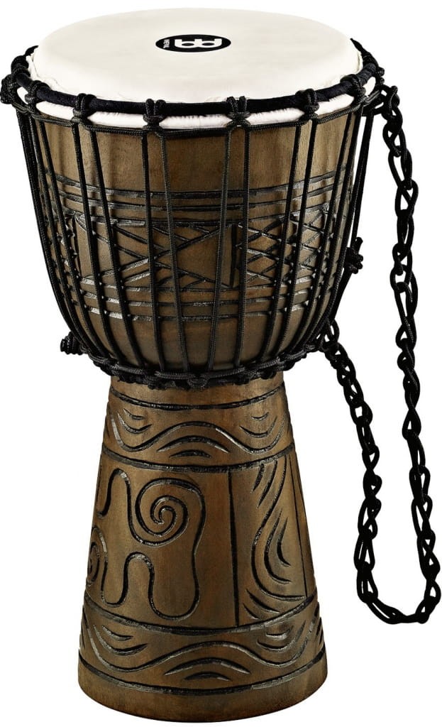 Drewniane Djembe z serii ARTIFACT z naciągiem sznurkowym starannie wykonane z jednego kawałka drewna mahoniowego.
