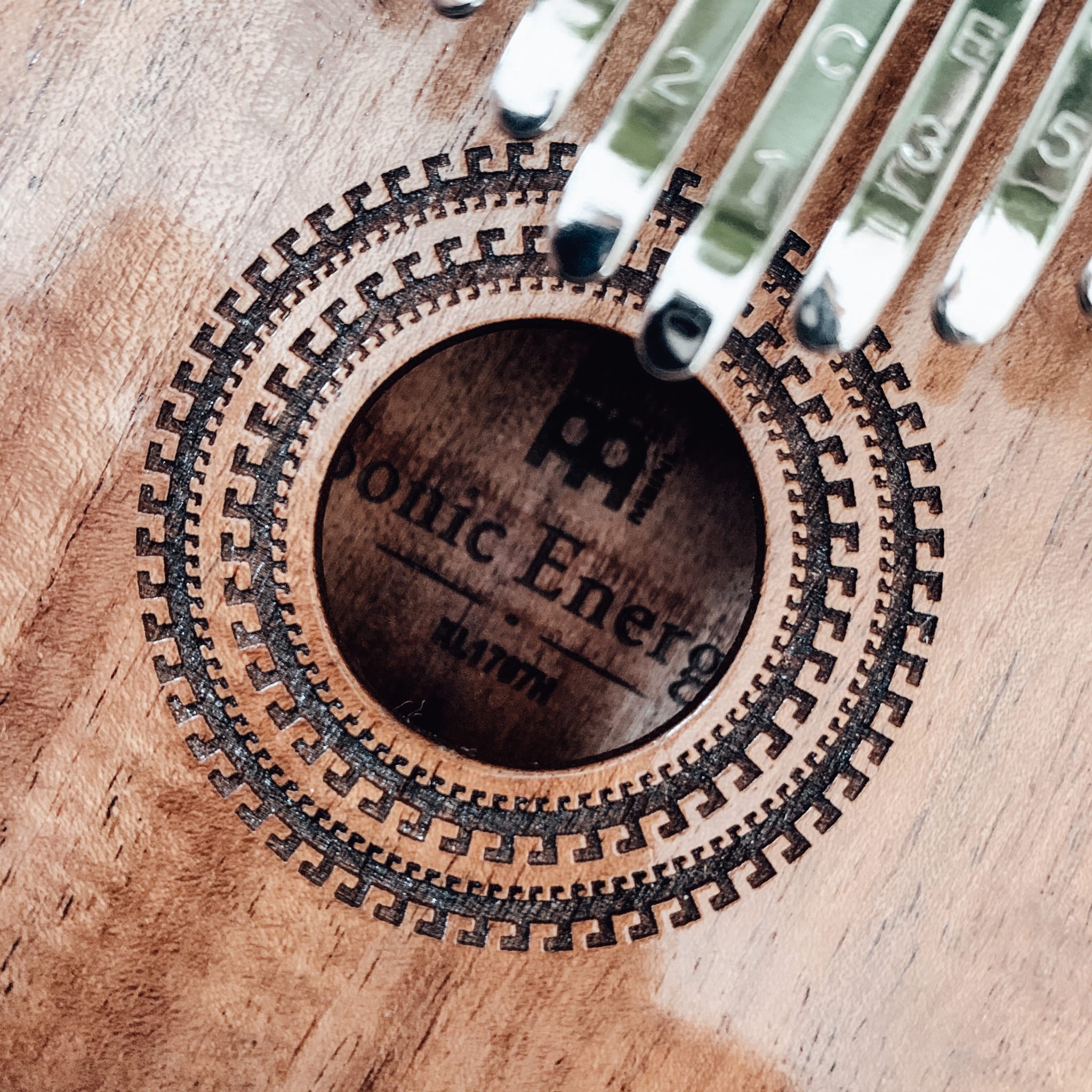 Tradycyjny otwór dźwiękowy tej Kalimby tworzy cieplejsze tony i dłuższe wybrzmiewanie.