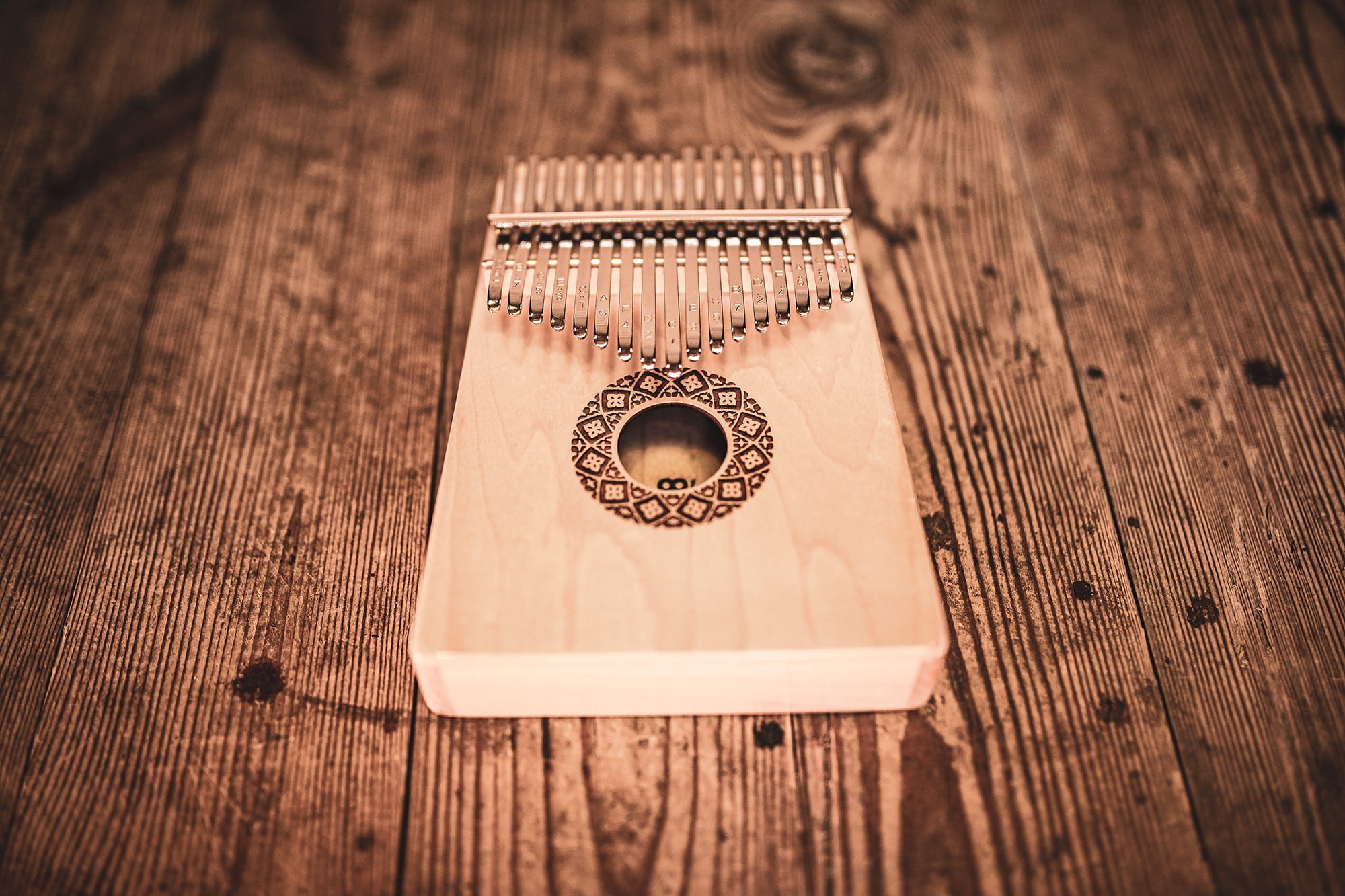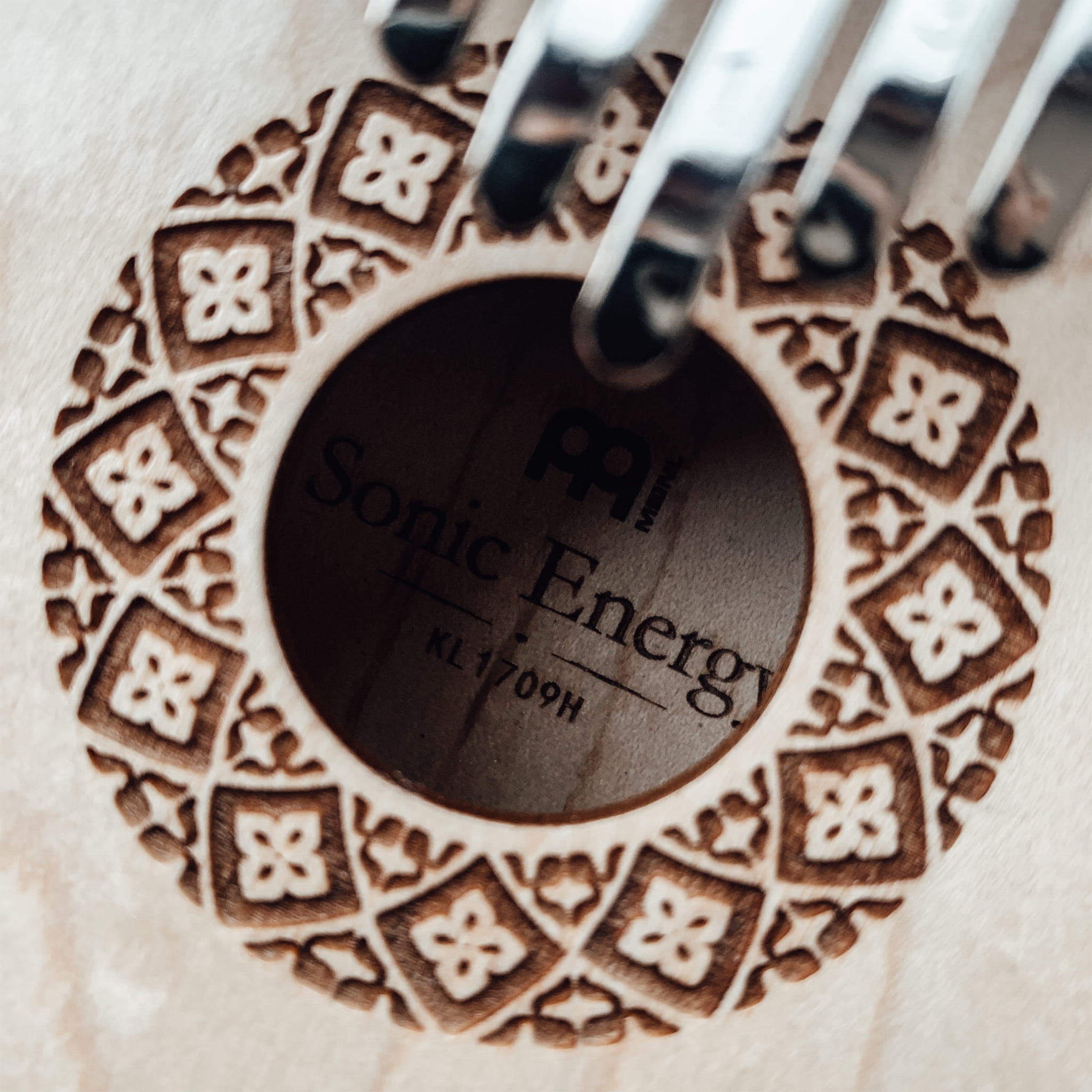 Tradycyjny otwór dźwiękowy tej Kalimby tworzy cieplejsze tony i dłuższe wybrzmiewanie.
