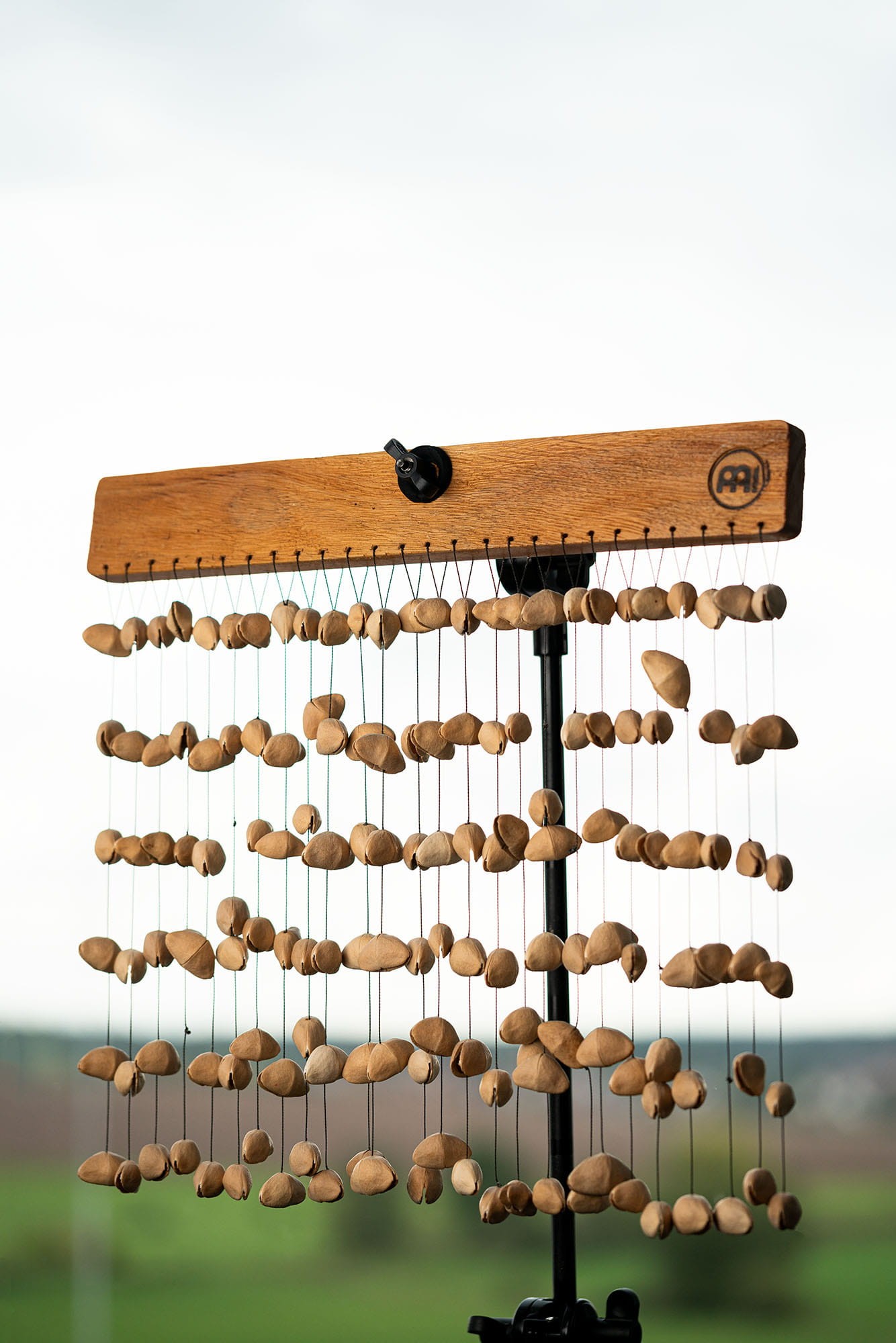 Łupiny orzechów Kenari, przymocowane do litego kawałka mahoniu, tworzą wyjątkowy, wszechstronny instrument.